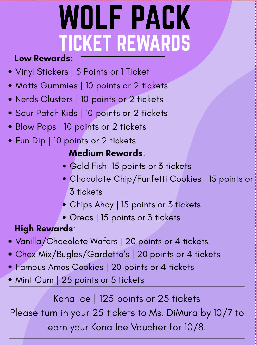 You may also start to redeem 25 tickets/125 points (or a combination of both) from October 1 to October 7 for Kona Ice. Kona Ice will be on campus October 8 during lunches. Please see AP DiMura for redemption.